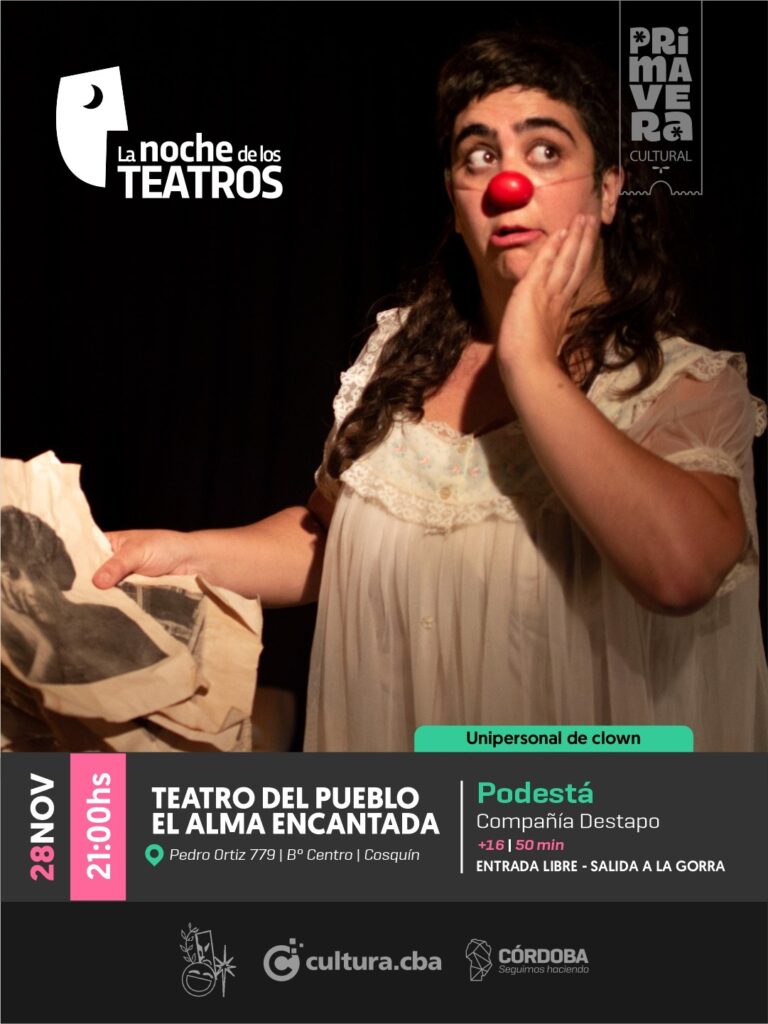 Charlamos con Gisela Podesta, protagonista e integrante de la Compañia Destapo, que llega al valle de Punilla por primera vez con la obra “PODESTA”, un unipersonal de clown que se mete de cabeza en el árbol genealógico del teatro argentino. Una payasa en busca de su legado circense entre ficción, ancestros y carcajadas que también hacen pensar. Una experiencia teatralque llega desde Traslasierra que no se calla nada y lo transforma todo”.